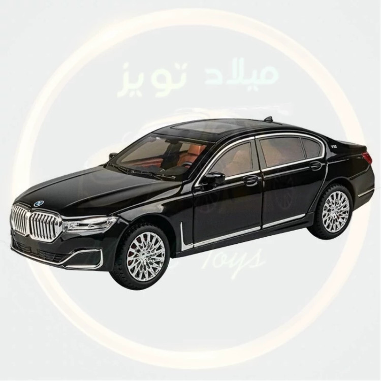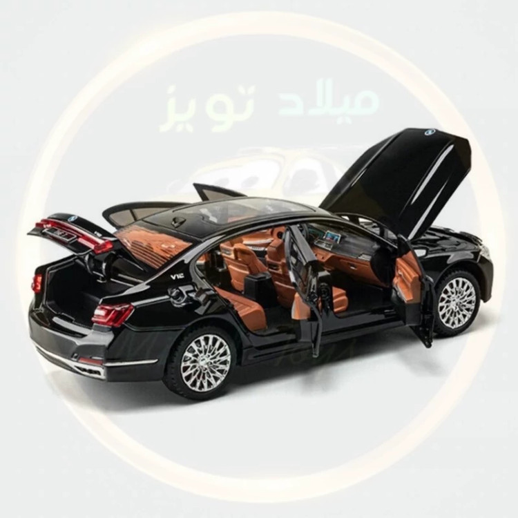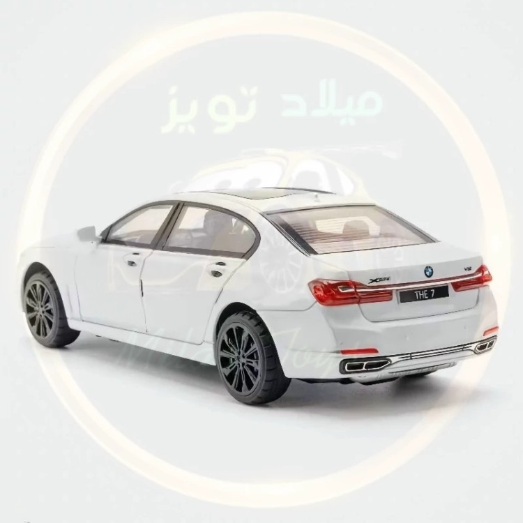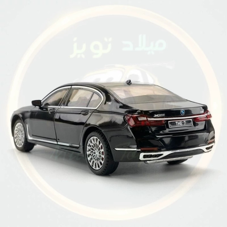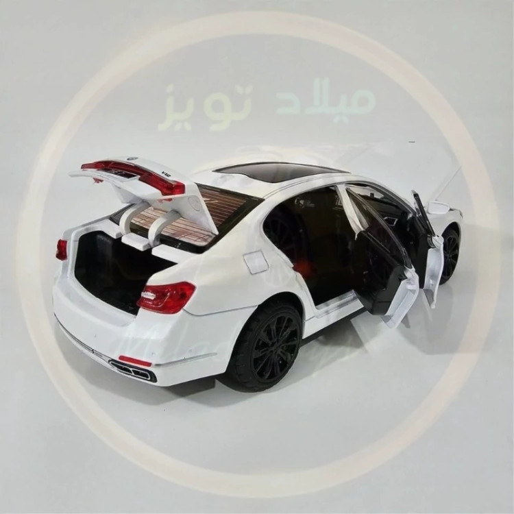 ماکت بی ام و سری 7 فلزی عقب کش صداوچراغ وبوق دار 6 درب بازشو درب باک بازشو طول 20 سانت کمک فنردار برند چژی سقف شیشه ای